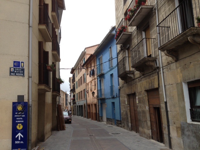 Before you get into the old part of Pamplona, you walk for hours thru the city leading up to it. Lights and traffic seem weird after the trail. But then you walk up to this citadel, that’s what it seemed like, anyway you actually have to cross a drawbridge to get into the city. Then colorful houses, ribbons and streamers everywhere. And finally our hostel. We showered then did our laundry in the sink, then went exploring. Dinner was a pilgrim lunch, sandwich, fruit,juice and Al added a bottle of wine to our menu again. I insisted we share this bottle, so we invited this German man we met on the train and had a really nice conversation about Germany and the differences between us and them.