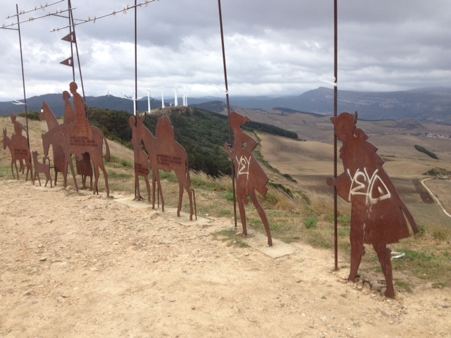 then we walked onto a range of hills leading up to a very steep hill /mountain called the Hill of Forgiveness, Alto del Perdon at 2,590 feet. As we look back I can’t believe Pamplona is so small in the distance. We had already walked so far today. We are Definitely stronger today, but the back side of this hill was horrible, all boulders and loose stone, it took us a longer time going down then up. We needed to watch where we put every step.
