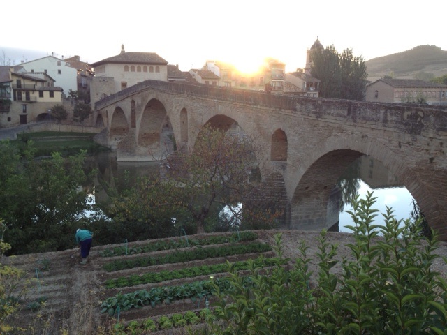 The first 2 albergues w stopped at were already full, and we are still early, only 3pm. I can’t believe how many people are walking right now, we had to walk to the edge of town to find a place, but it was nice. We had to walk across the Queens bridge then only 300 meters, all up.We actually got a private room with just 2 bunk beds, ohh la la! The bad part was the incline to get to the place. It is built on a bluff and it was truly straight up. The queens bridge has 6 arches that span the Arga. Really impressive to think they built this so long ago. The roads are like that also, made of brick or cobbled stone rubbed smooth by countless footsteps.