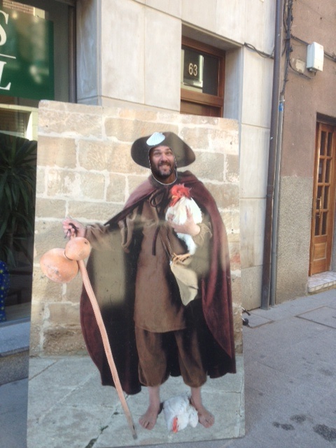 After that we walked thru Santo Domingo de la Calzada, which has an interesting legend. It has to do with chickens, so already I was interested. Legend has it that a pilgrim couple and their son stopped off in this town on their way to Santiago. The son caught the eye of the inn keepers daughter, but the boy, very devout stayed firm against her advances. So in anger she hid a silver goblet from the church in his bag and said he had stolen it. They caught him and sentenced him to hang. Some say the parents had left the boy thinking he would catch up, but he didn’t. So on their way back they found him hanging on the gallows but by miracle from Santo Domingo, he was still alive. They told the sherif, “our son is no thief, take him down as he is still alive.”The sherif said, “your son is no more alive then this chicken I am about to eat.” Then his chicken jumped up and crowed. So they all rushed out and cut down the innocent boy. To this day the city is named after this legend and there are chicken plaques and roosters all over the place. I know kinda silly. But I like the chickens. Al wouldn’t let me get anything because then we would have to carry it. He did promise me in Santiago I can get something. He always says that, it means no.
