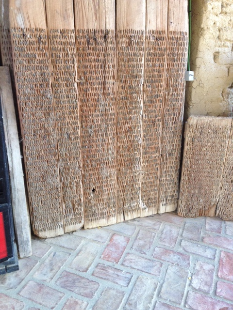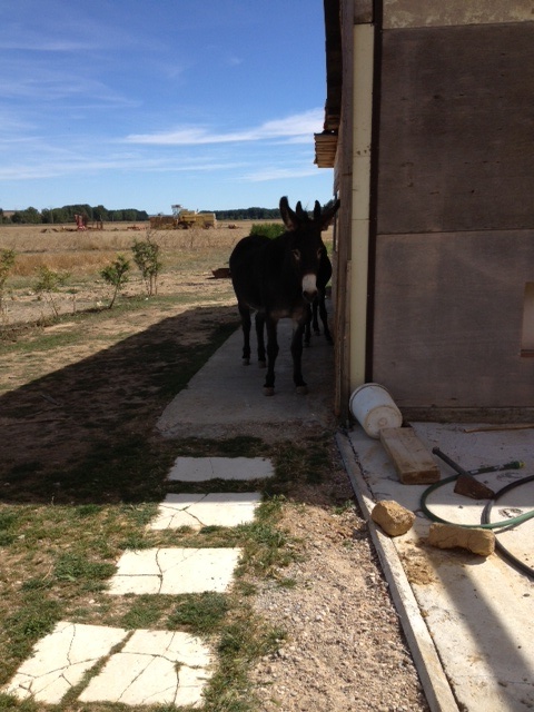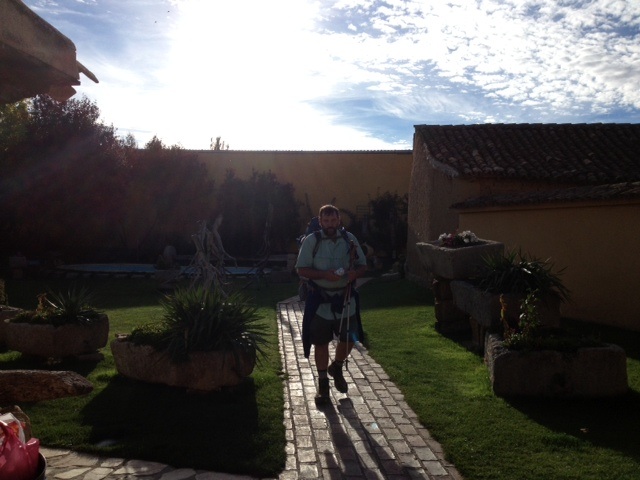 We came into a town that used to boast a pop. of over 2000 that has now shrunk to less than 200. Another pretty town with a big church. We stopped here for a coffee break at a fantastic albergue. It had a landscaped garden with a pool, iron worked sculptures and flowers in granite urns.There was a big apple tree in the center with a grape vine threaded through it. The best part was that they did not serve coffee in the traditional sense, first the owner/son sent us back out with two big cups, then he came out with these two pots, one had hot rich coffee and the other hot milk. His mom had made an almond cake and an apple tart. We resisted those. But we asked to get bocodillas to go, he said he would make us something better than the normal ham and cheese sandwich. He made a ham, cheese and onion omelet and stuffed that into 1/2 a loaf of homemade bread. I wanted to move in and never leave. We marked this in our book so next time we make sure not to bypass him.