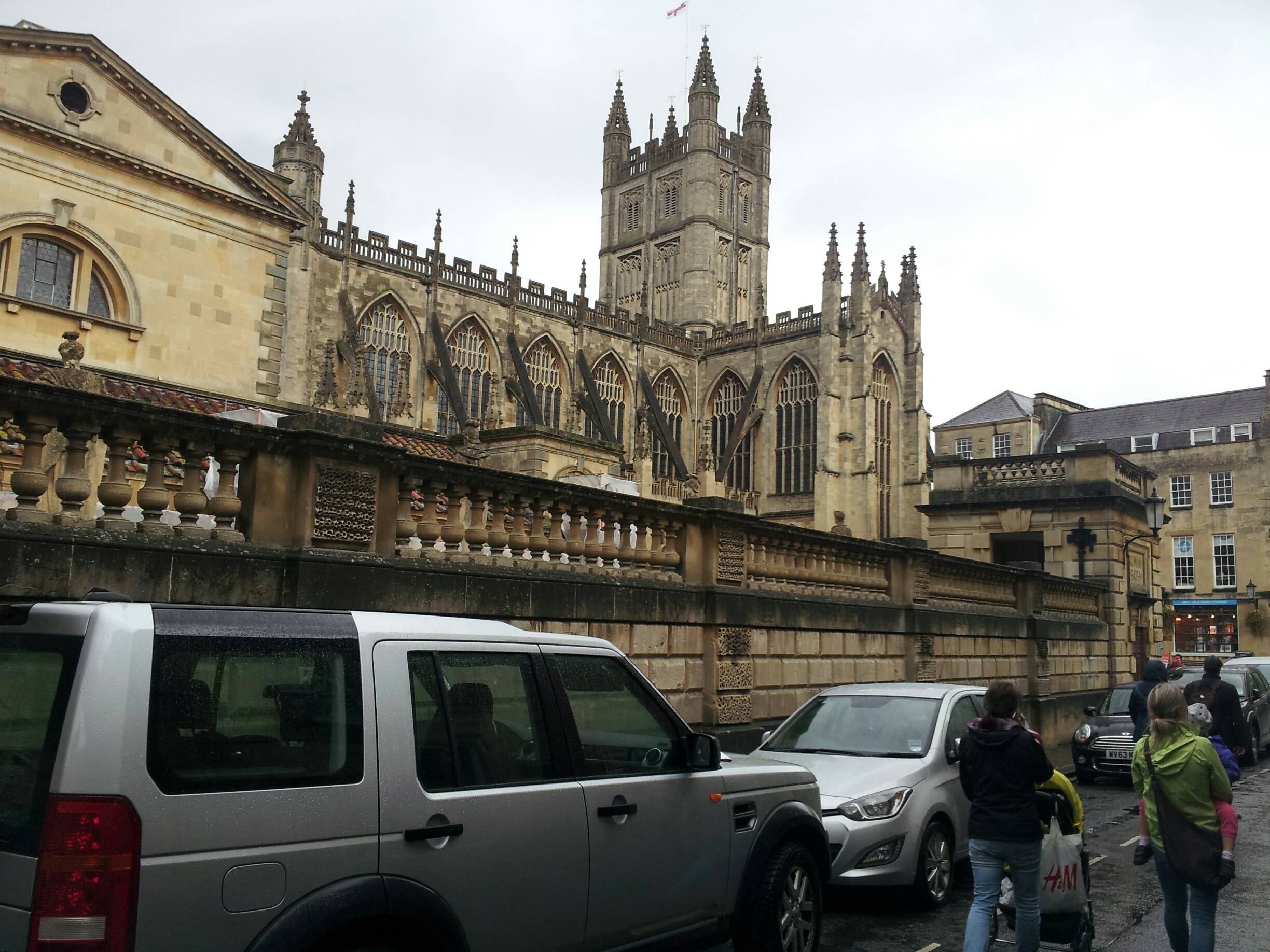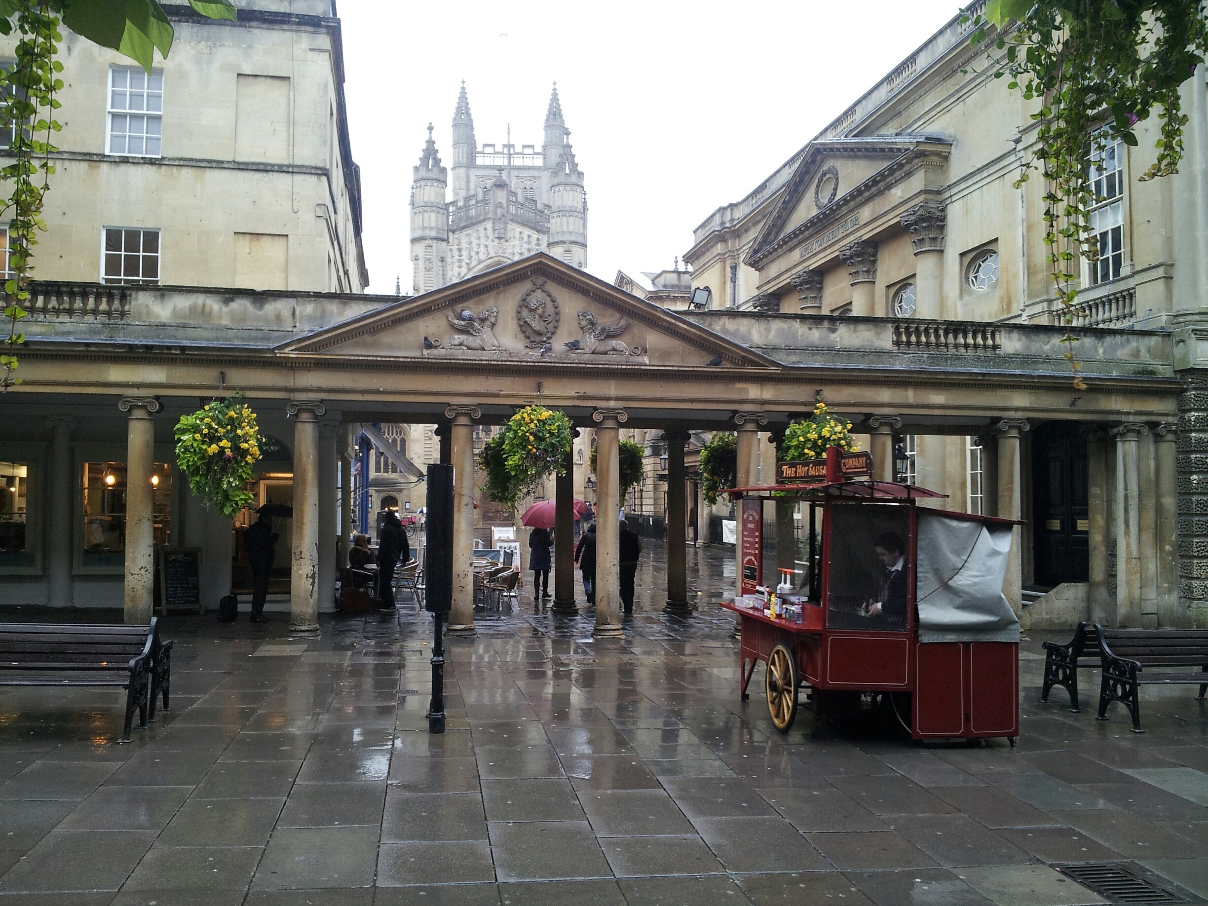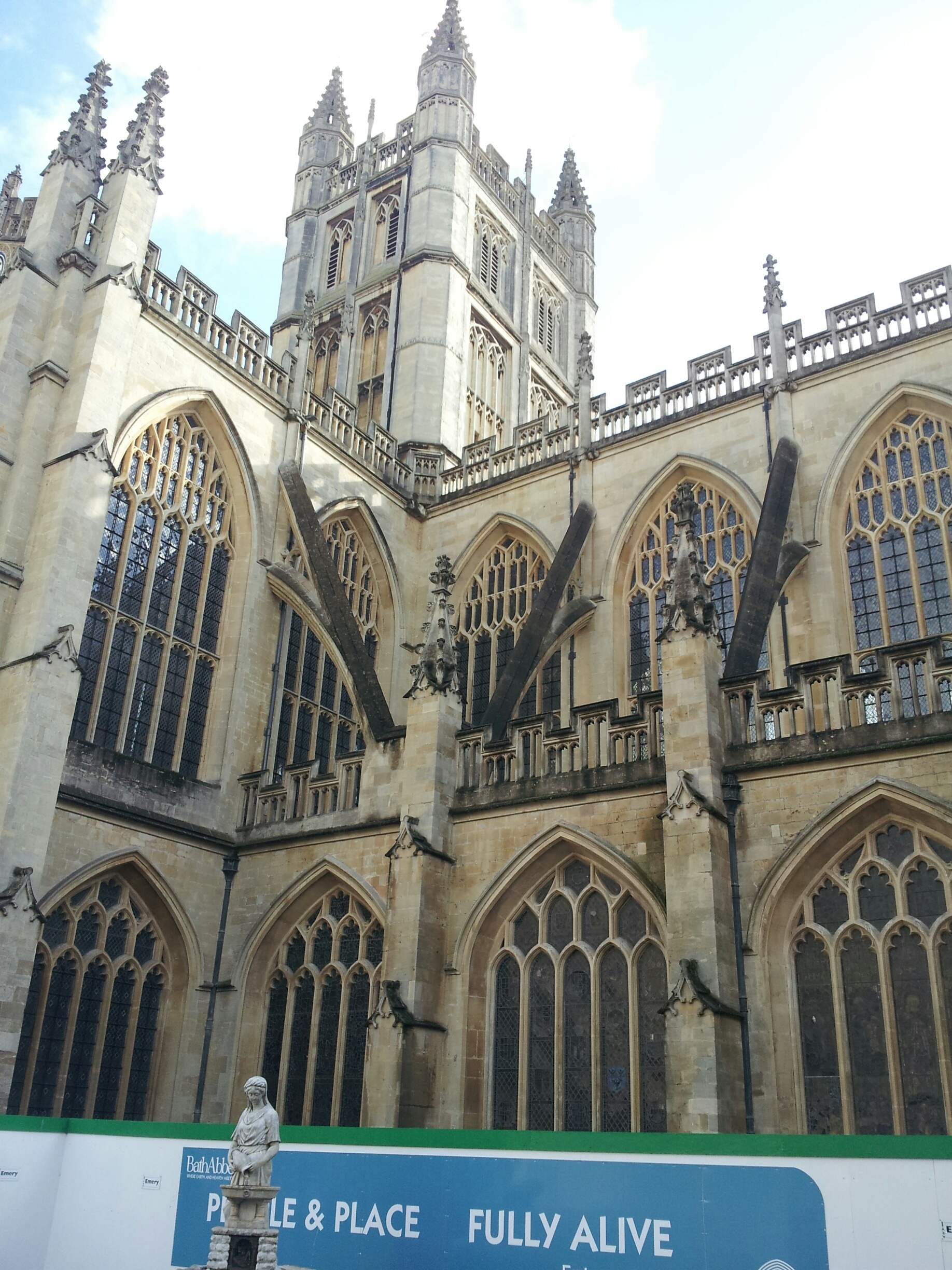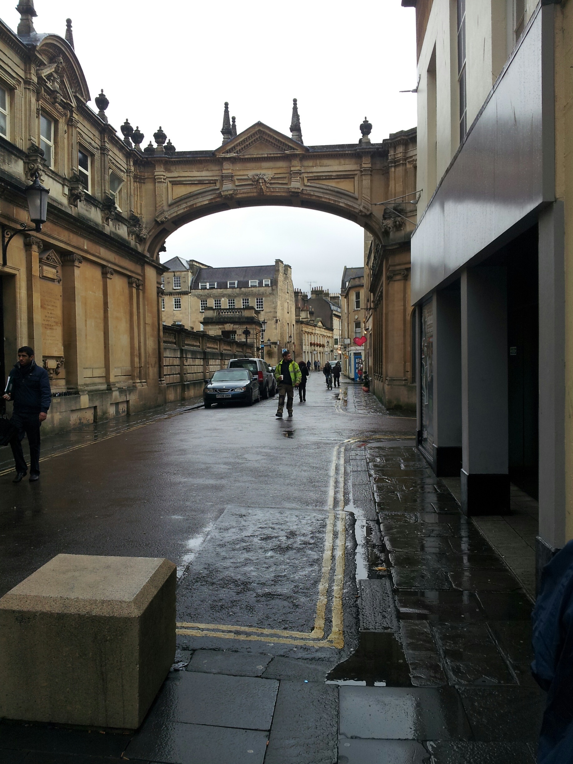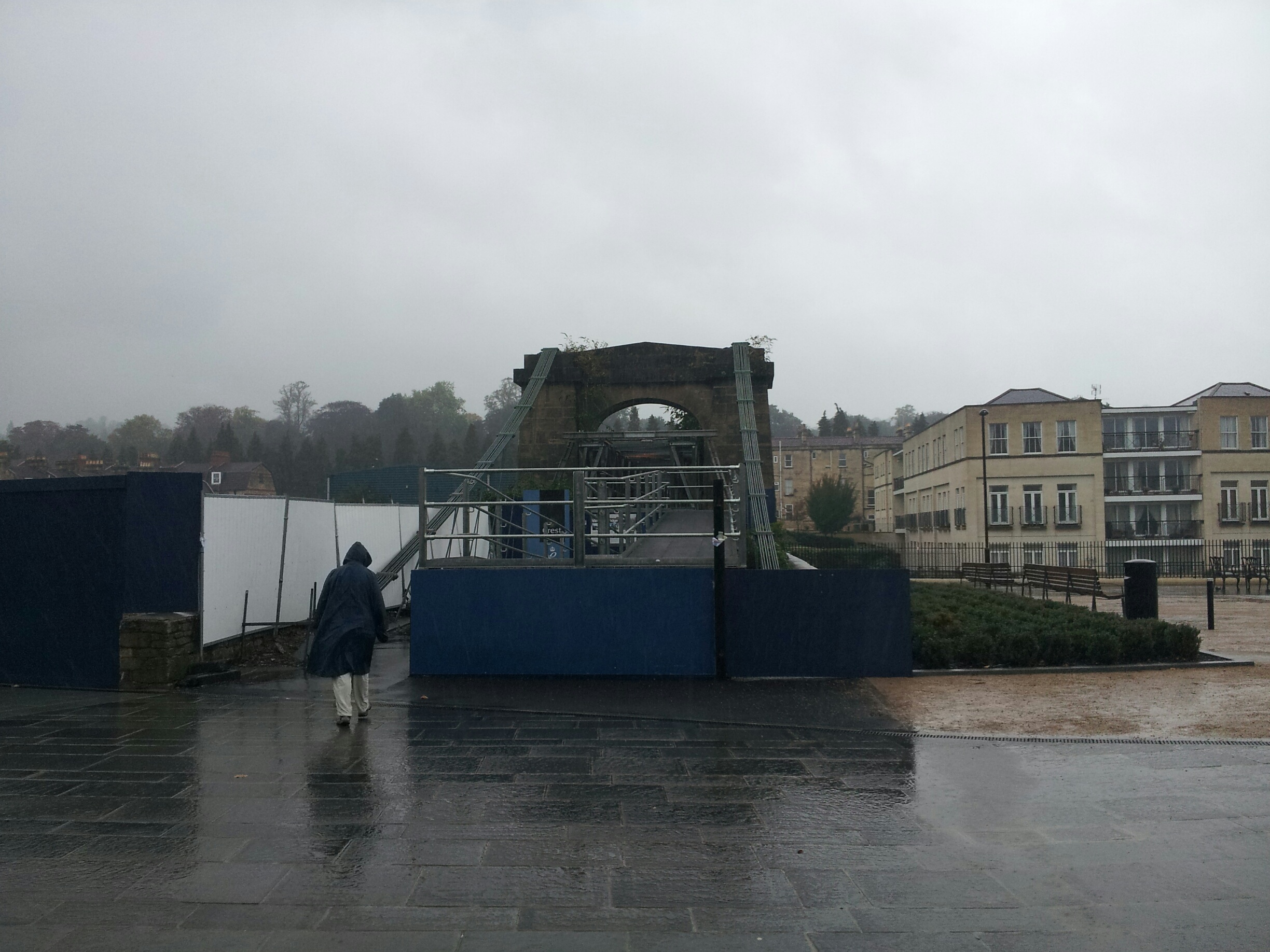 First day in Bath, pouring rain! But we have raincoats so we are out the door early and walking into town. It is only a 20 minute walk but cold and wet. We had to cross the Victoria Bridge, which is in the process of being repaired. the old bridge was becoming unsafe, so this bridge is a temporary one and has ropes and scaffolding all over the place. there is driving rain, fierce winds, plastic is flapping and I march right across. the new me. We are going to the Roman Baths!