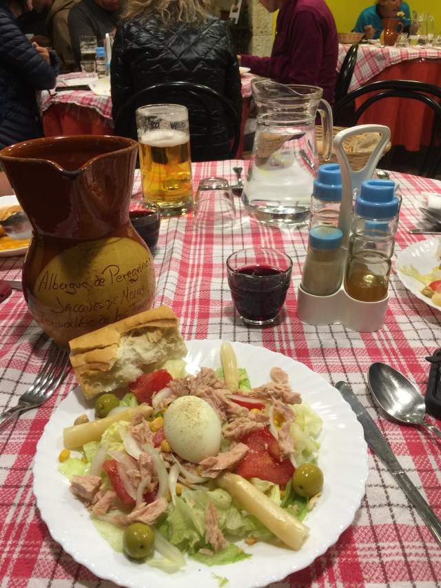 Tonight we got a pilgrim meal and ate with AJ. It was nice. Pilgrim meals are usually great. They always start you out with, bread, a bottle of wine and a jug of water. Then there’s usually a choice, soup, salad, which is a whole another conversation,