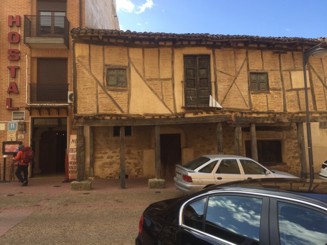After we had walked about 12km I was officially starving. We packed our stuff, granola bars, fruit, I also have some carrots. I’ve been trying to find peanut butter, so far no luck. You do kinda get tired of what’s in your backpack and either trade people or eat somewhere. We had arrived at a pretty big town,Sahagun, and had a fantastic lunch there. We walked into this place, from the outside it doesn’t look like much, but man, the food was fantastic! All we had were hamburgers, but they had eggs and bacon on them, lettuce, tomato and onion. AJ tried to order fries but we ended up with shrimp cooked with garlic. π€