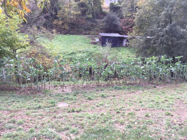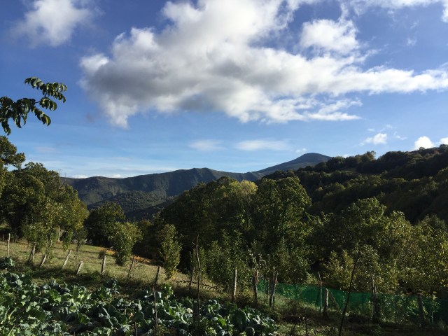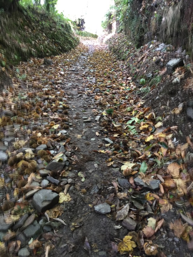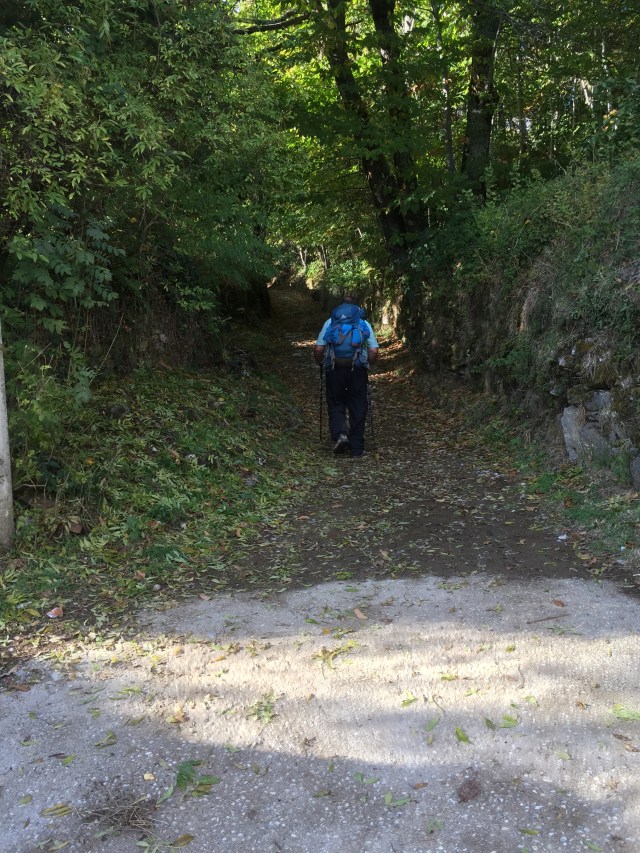 Parts of the trail were very narrow and it was like step climbing for a few hours. Also there were horses. Some people take horses up this part. The end of today was mostly all woods. Then all of a sudden there were gardens and houses. People picking up chestnuts, which were everywhere. Walnuts too! I had a pocket full and every once in awhile would smash one with a handy rock.