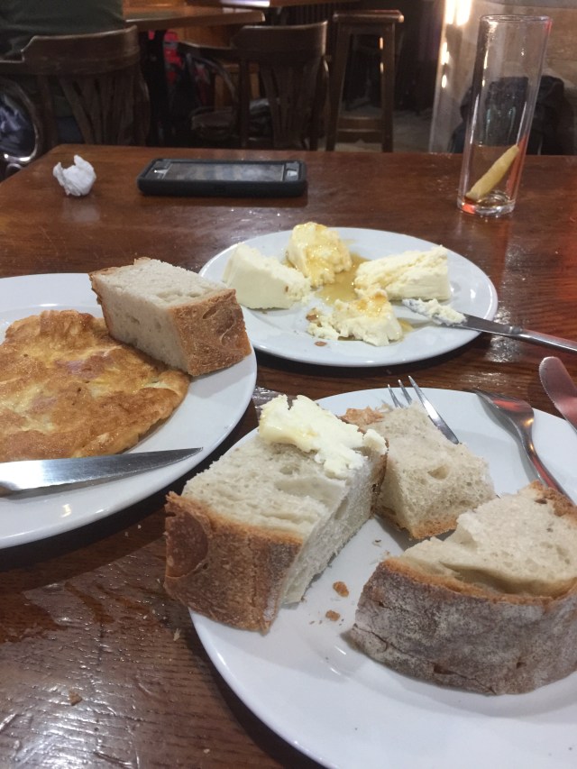 We stopped here last time also, but this time of year only one place open. I just get a coffee and Al a soda. We left without eating this morning but felt ok. Another pilgrim was raving about the cheese and said we should try it. Well Al got an omelette and I got an order of cheese and bread. Oh my goodness!!!! The cheese was something they make themselves, soft, sweet and yellow. Then they drizzled honey all over it and served that with fresh crusty bread! Oh I ate every bit and I didn’t even think I was that hungry! It was fantastic!