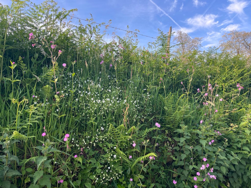 Of course we started up a hill, we must be getting stronger because it wasn’t so bad today. Just a few minutes out of the city there are farms. Flowers are growing everywhere, gardens along roadsides, just wonderful. Today was a combination of woods and road walking.