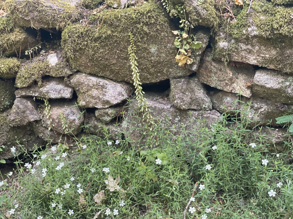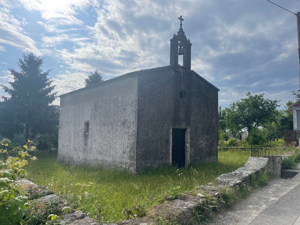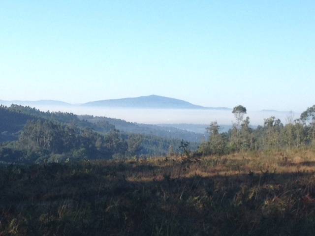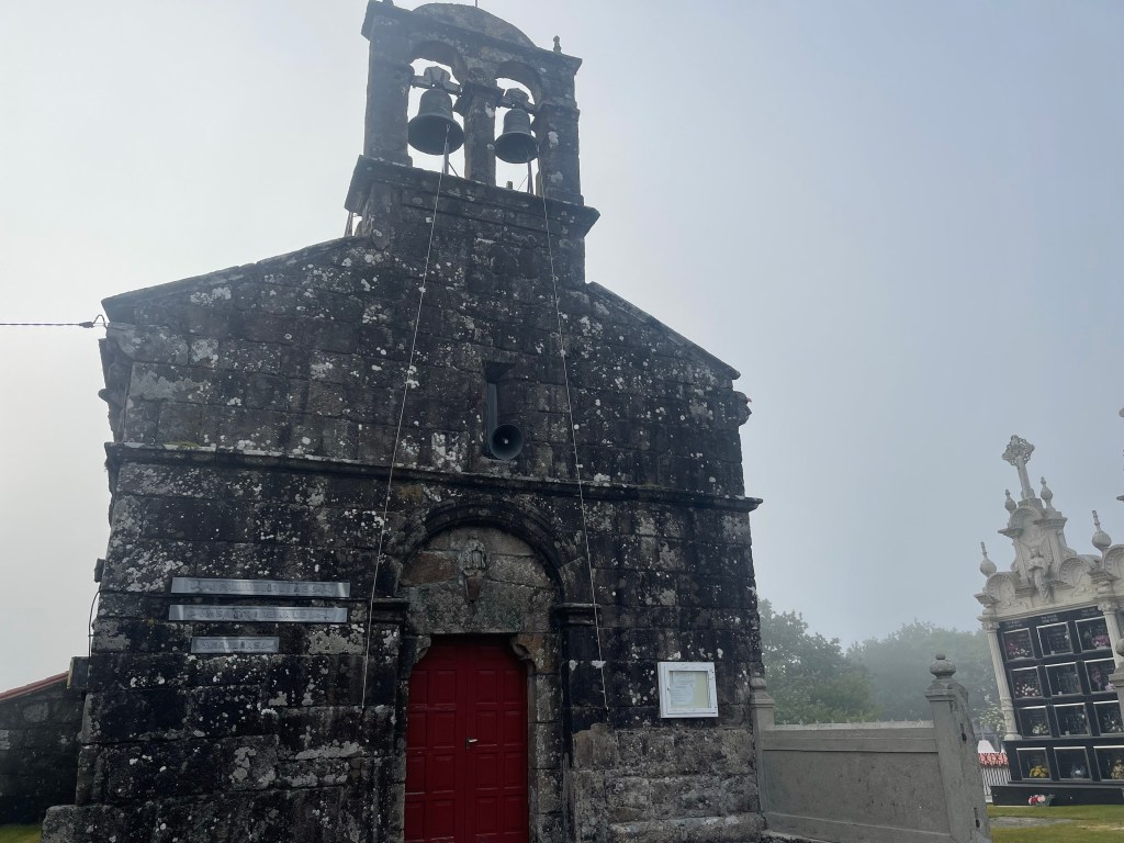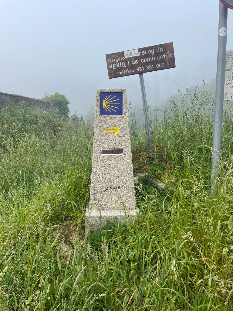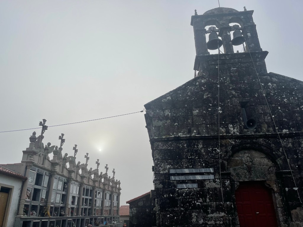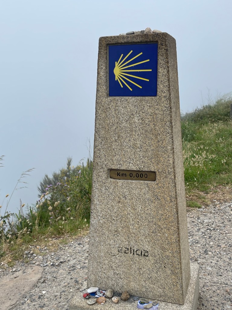 As I said earlier it is about a 3 kilometer walk out to the very end of Fisterra and that tip of land that juts out into the water where the land ends and ocean begins. We made our way out of town following another couple on a slight incline. Then we were joined by 5 elderly gentleman. Then a few more people. Soon we were a line of people walking down the side of the road in fog. Yes, a complete whiteout. At first it was lovely, the road was winding up, wispy clouds were drifting by and then .. where’s the road?? It occasionally got better. We could certainly see where we were going but I wasn’t climbing down any rocks when I couldn’t see where my feet where. There was a Hostel, a cafe and a gift store. There was also a person playing his guitar for some spare coins. We sat in the parking lot in the fog and I’m not sure when the sun set but we drank our wine and headed back.